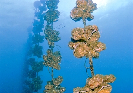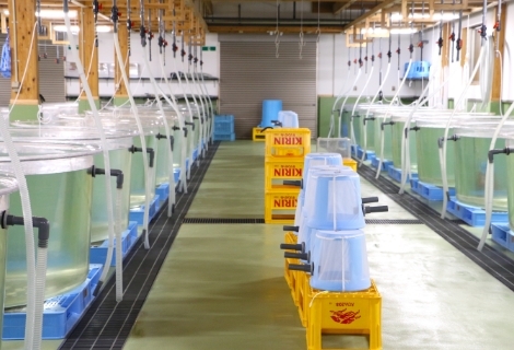 無事、コレクターに付着した稚貝は1ヶ月程水槽で育てられた後、生産者の手に渡り、より餌が豊富な外海に移されます。