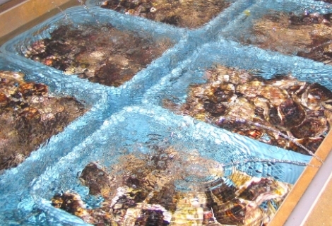 「隠岐のいわがき」養殖は採苗(イワガキの稚貝をコレクター(基質)に付着させること)から始まります。親には隠岐生まれのイワガキのみを用い、採卵の後、水槽の中にホタテ殻等を束ねたコレクターを沈めて、ふ化した稚貝が付着するのを待ちます。